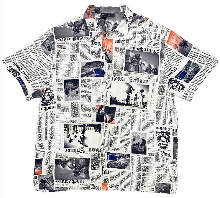 ニュースペーパーの総柄プリントの開襟シャツ。